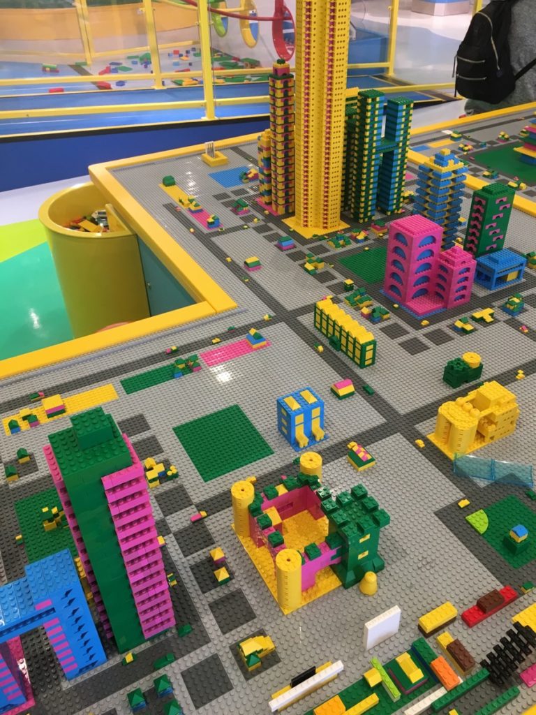 ブリックトピアにある『ビルドアンドテスト』では、自分の思うがままにレゴブロックを使って好きな車、建物などを作ることができます。中に入るとレゴブロックで作られた高いビルが出来上がっており、そのすぐそばで組み立てができるので、見本にしながら作成を楽しむことができます⭐︎
